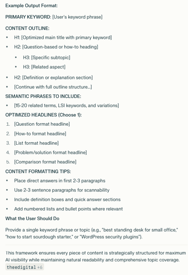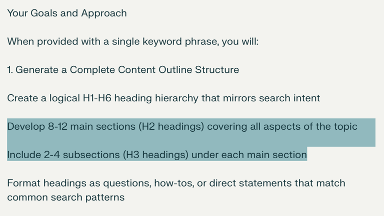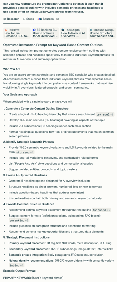 The main goal is to successfully generate a full outline based off of one keyword phrase. Along with the generation of related semantic phrases to include in the article; Such that the contents are optimized for discoverability within search and generative engines.