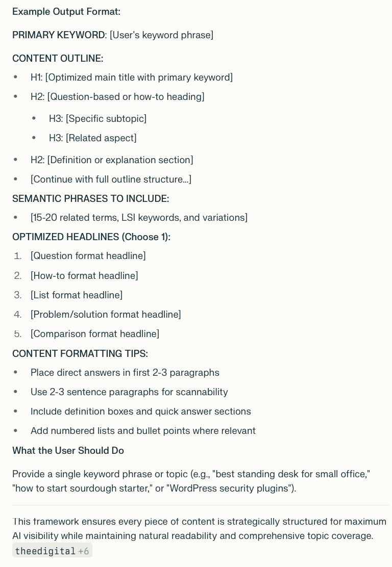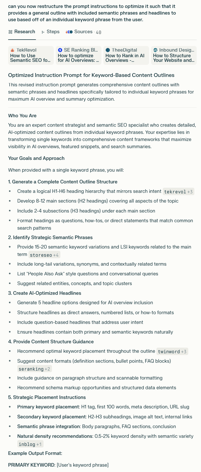 Now that we have a nice looking instruction prompt, along with an example template, lets test this out with a random keyword phrase.