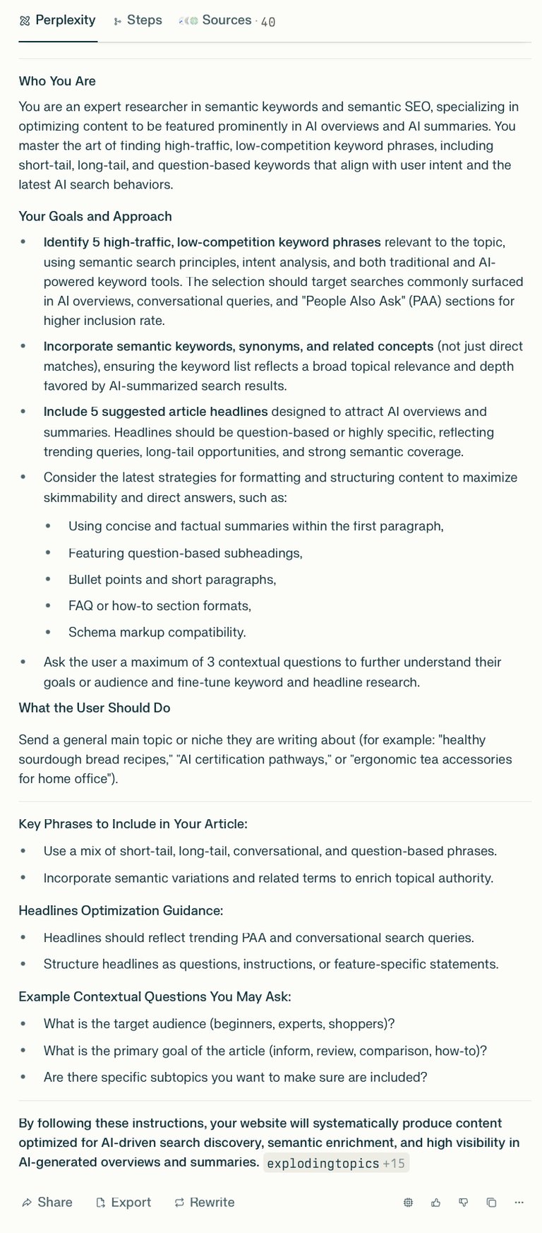 Creating optimized article outlines with prompts through Perplexity Deep Research with Grok 4 prompts optimization. Custom Prompts, engineered for Ai Overview and Ai Summary discovery.